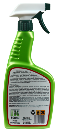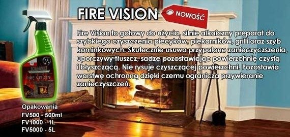 Fire Vision to gotowy do użycia, silnie alkaiczny preparat do szybkiego czyszczenia piecyków, piekarników, grilli oraz szyb kominkowych. Skutecznie usuwa przypalone zanieczyczszenia, uporczywy tłuszcz, sadzę pozostawiając powierzchnię czystą i błyszczącą. Nie rysuje czyszczącej powierzchni. Pozostawia warstwę ochronną dzięki czemu ogranicza przywieranie zanieczyszczeń.
